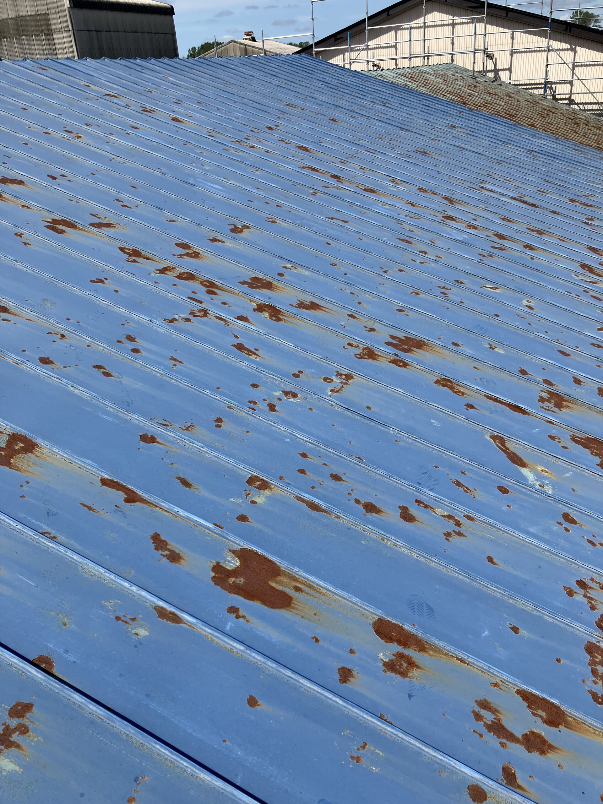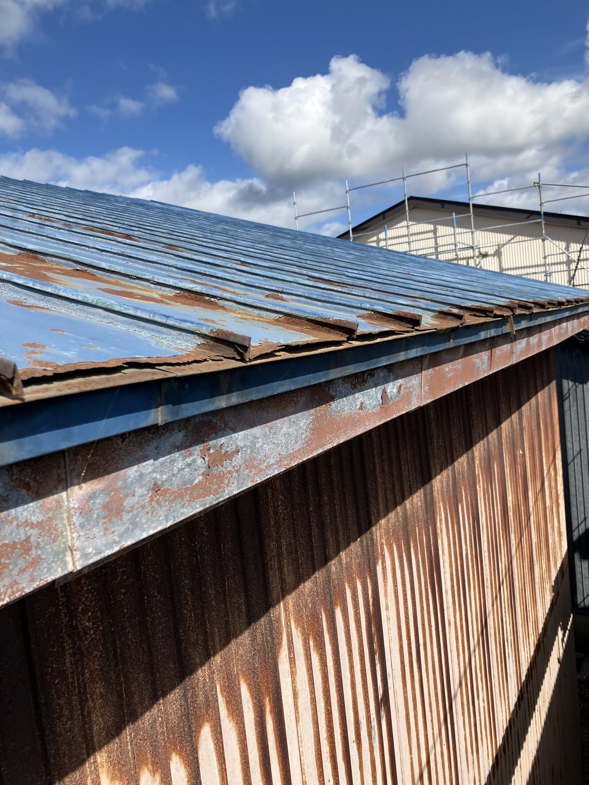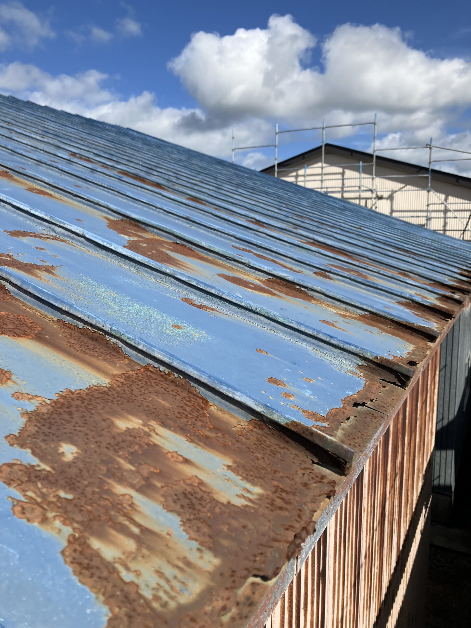 大潟村の格納庫の塗装、板金工事を依頼されたお客様から今度は隣りの格納庫の屋根の葺き替え工事と破風の板金工事を依頼されました。現地調査をした所、屋根の下地が大分弱ってたので既存の屋根を剥がないでカバー工法で施工します。