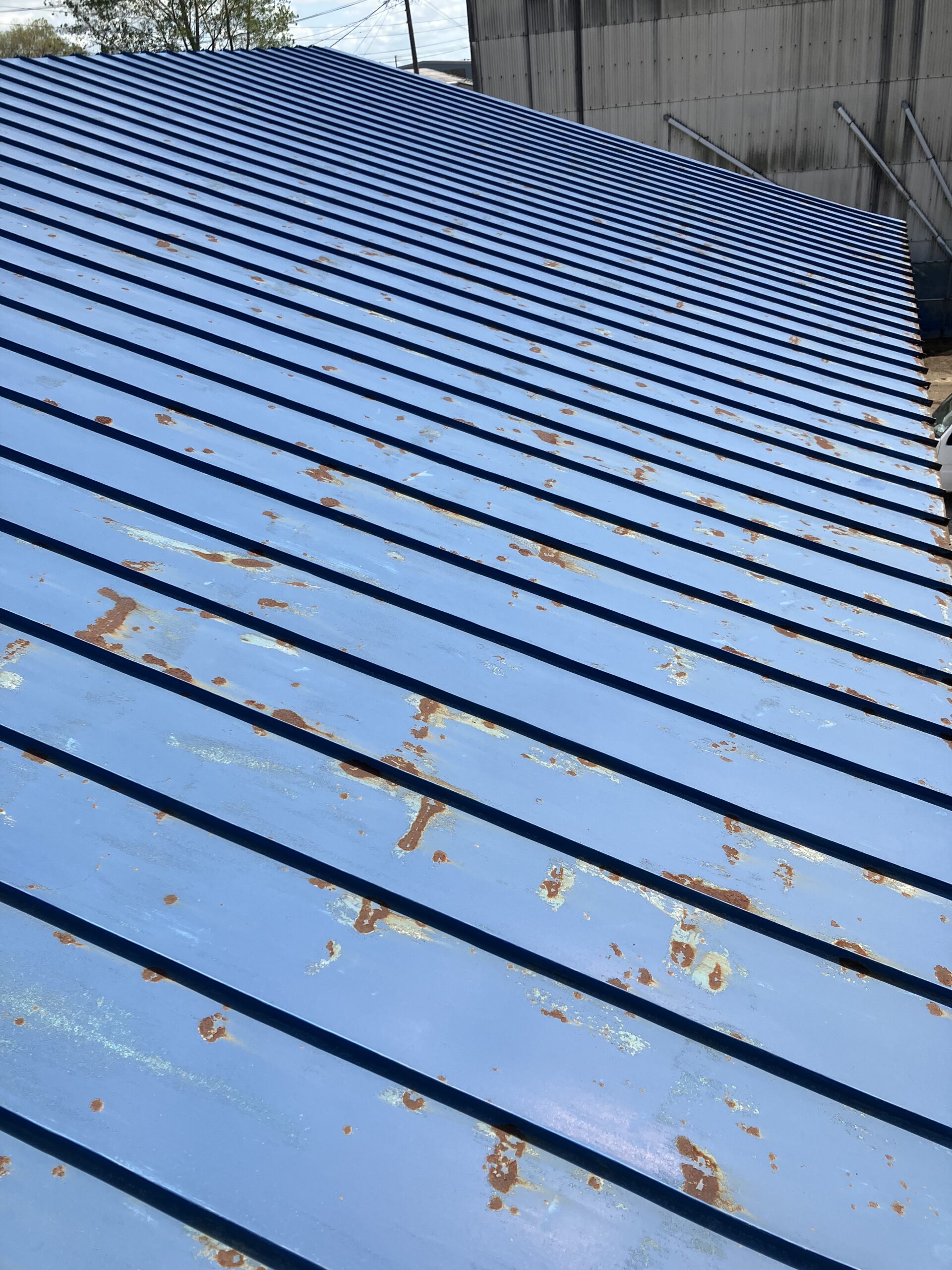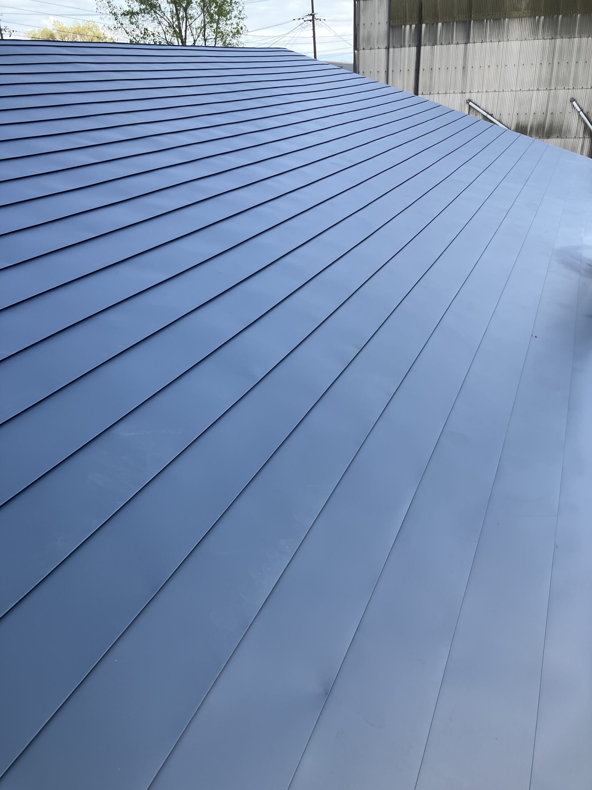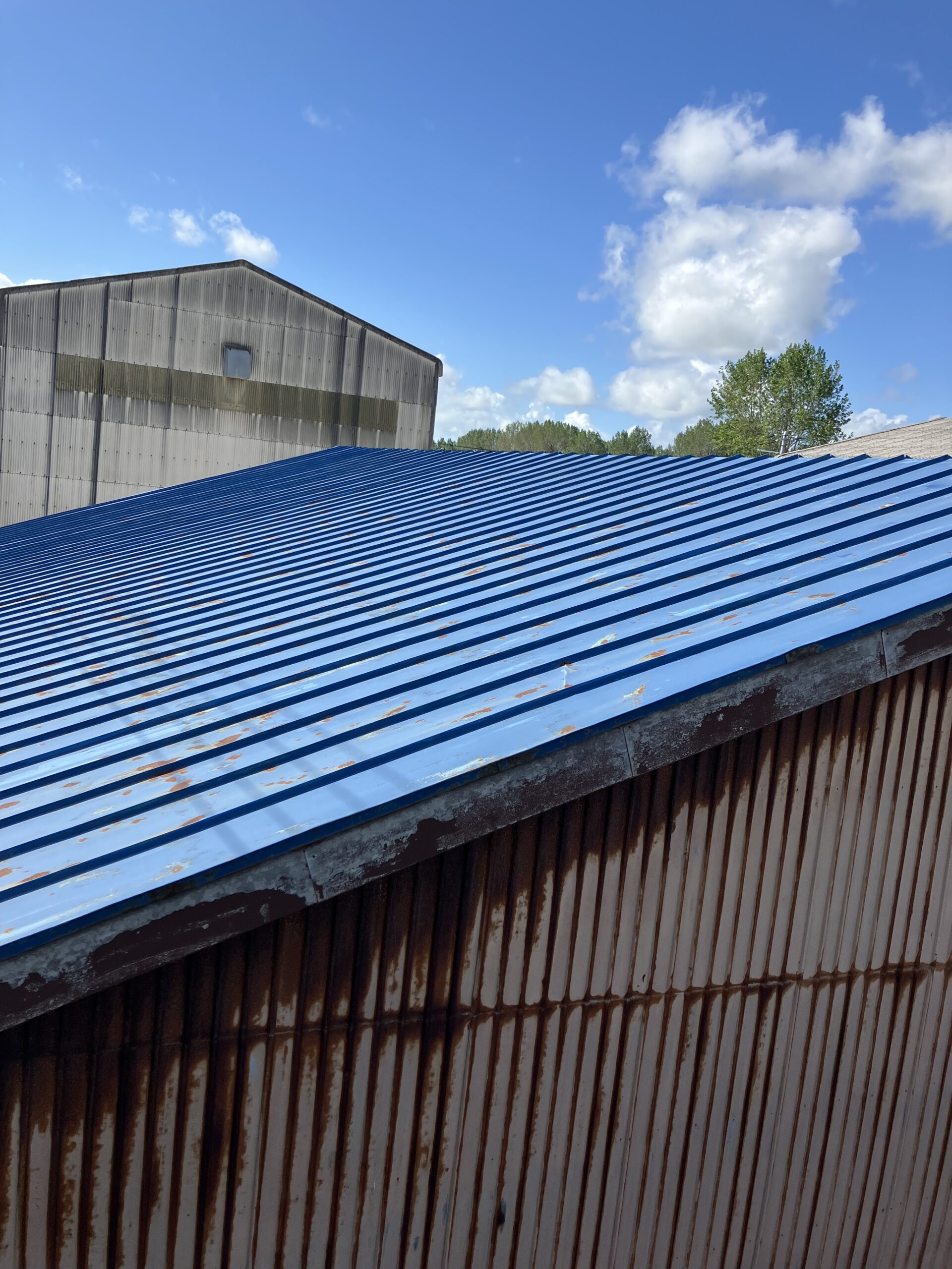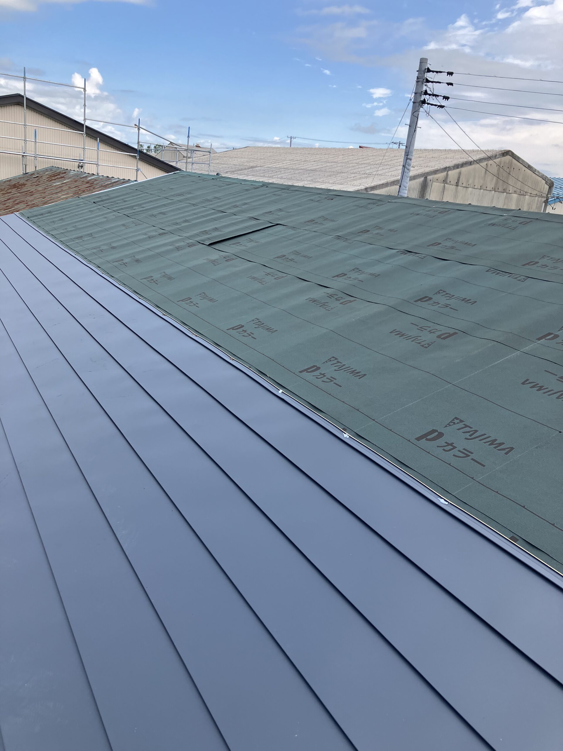 大潟村の格納庫の塗装、板金工事を依頼されたお客様から今度は隣りの格納庫の屋根の葺き替え工事と破風の板金工事を依頼されました。現地調査をした所、屋根の下地が大分弱ってたので既存の屋根を剥がないでカバー工法で施工します。